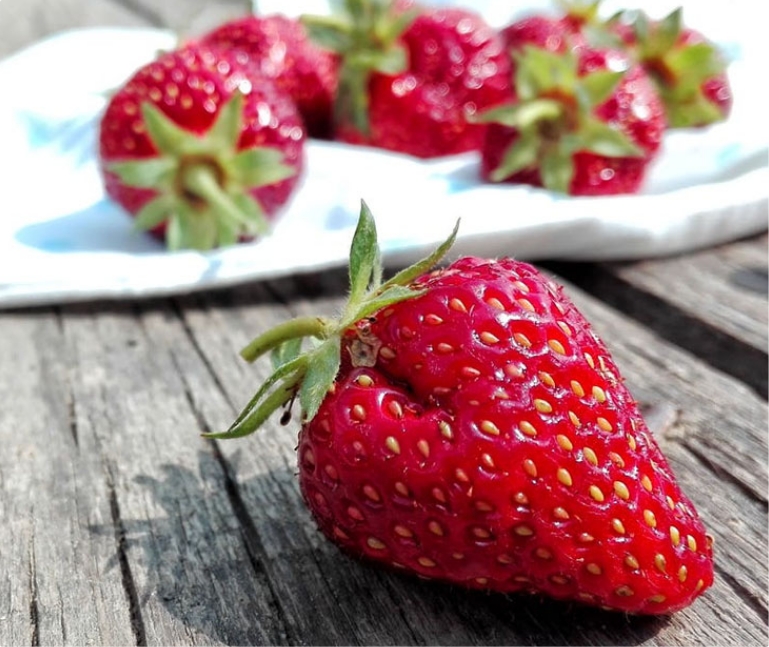 The garden strawberry is a widely grown hybrid species of the genus Fragaria, collectively known as the strawberries, which are cultivated worldwide for their fruit. The fruit is widely appreciated for its characteristic aroma, bright red color, juicy texture, and sweetness. It is consumed in large quantities, either fresh or in such prepared foods as jam, juice, pies, ice cream, milkshakes, and chocolates. Artificial strawberry flavorings and aromas are also widely used in products such as candy, soap, lip gloss, perfume, and many others. The garden strawberry was first bred in Brittany, France, in the 1750s via a cross of Fragaria virginiana from eastern North America and Fragaria chiloensis, which was brought from Chile by Amédée-François Frézier in 1714.